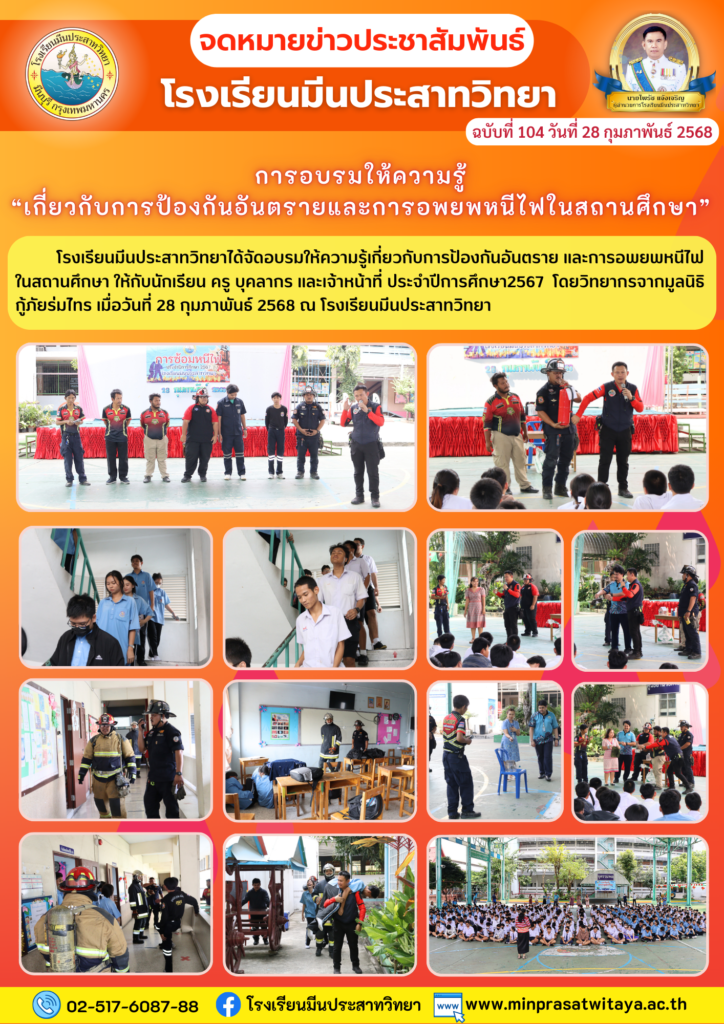 วันศุกร์ 28 กุมภาพันธ์ 2025โรงเรียนมีนประสาทวิทยาได้จัดอบรมให้ความรู้เกี่ยวกับการป้องกันอันตราย และการอพยพหนีไฟในสถานศึกษา ให้กับนักเรียน ครู บุคลากร และเจ้าหน้าที่ ประจำปีการศึกษา2567 โดยวิทยากรจากมูลนิธิกู้ภัยร่มไทร เมื่อวันที่ 28 กุมภาพันธ์ 2568 ณ โรงเรียนมีนประสาทวิทยา