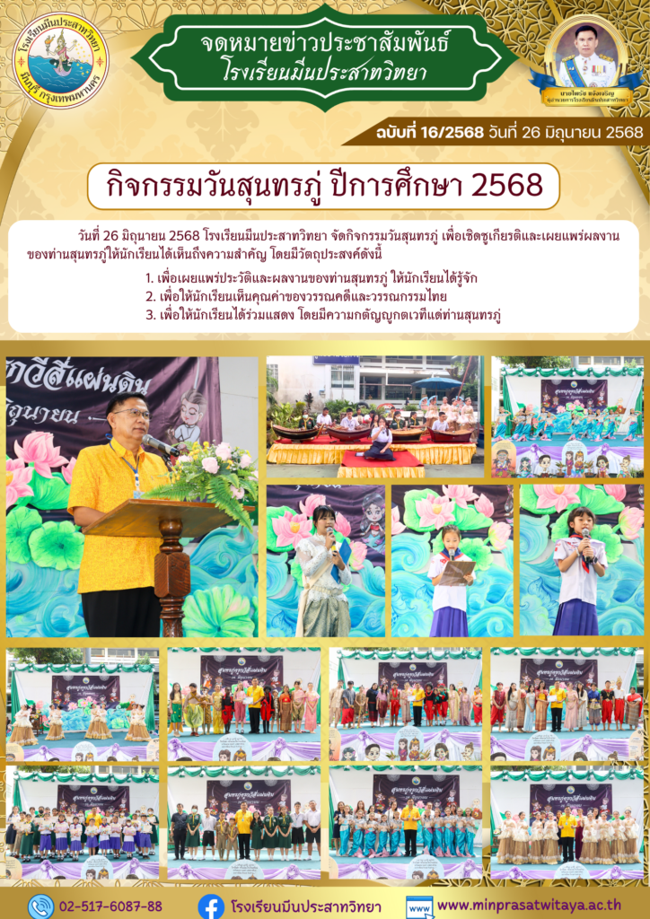 วันพฤหัสบดี 26 มิถุนายน 2025วันที่ 26 มิถุนายน 2568 โรงเรียนมีนประสาทวิทยา จัดกิจกรรมวันสุนทรภู่ เพื่อเชิดชูเกียรติและเผยแพร่ผลงานของท่านสุนทรภู่ให้นักเรียนได้เห็นถึงความสำคัญ โดยมีวัตถุประสงค์ดังนี้