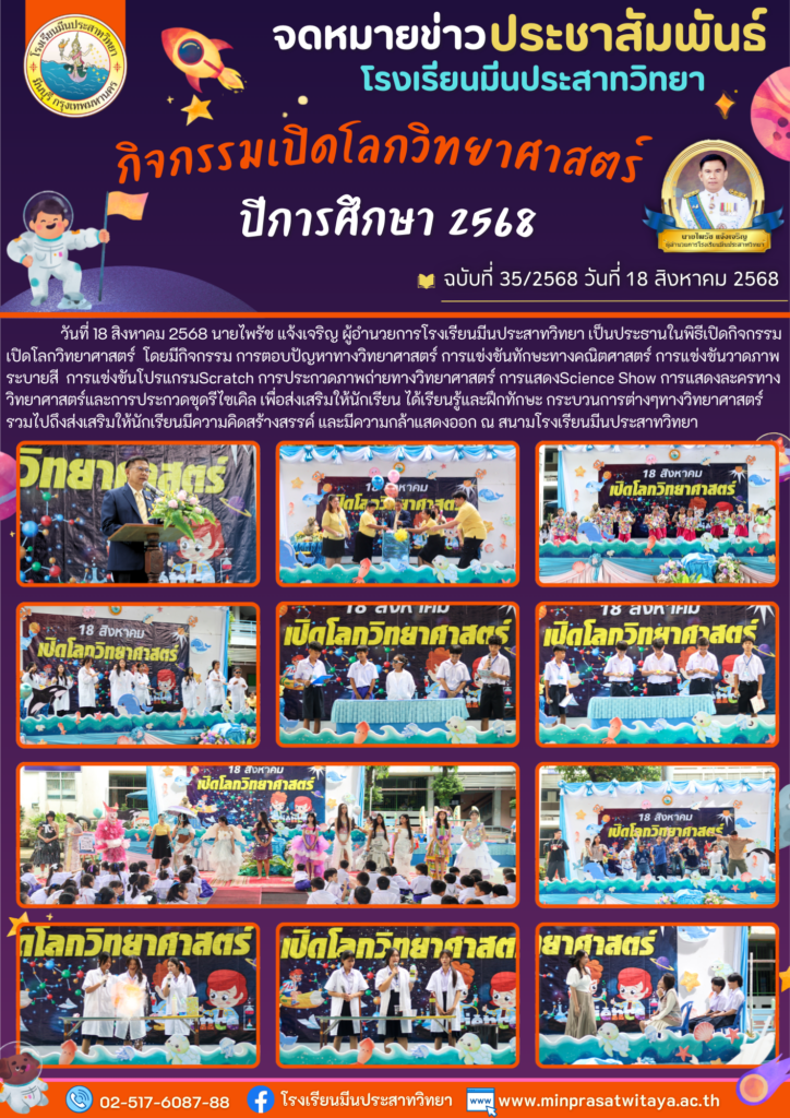 วันจันทร์ 18 สิงหาคม 2025วันที่ 18 สิงหาคม 2568 นายไพรัช แจ้งเจริญ ผู้อำนวยการโรงเรียนมีนประสาทวิทยา เป็นประธานในพิธีเปิดกิจกรรมเปิดโลกวิทยาศาสตร์ โดยมีกิจกรรม การตอบปัญหาทางวิทยาศาสตร์ การแข่งขันทักษะทางคณิตศาสตร์ การแข่งขันวาดภาพระบายสี การแข่งขันโปรแกรมScratch การประกวดภาพถ่ายทางวิทยาศาสตร์ การแสดงScience Show การแสดงละครทางวิทยาศาสตร์และการประกวดชุดรีไซเคิล เพื่อส่งเสริมให้นักเรียน ได้เรียนรู้และฝึกทักษะ กระบวนการต่างๆทางวิทยาศาสตร์ รวมไปถึงส่งเสริมให้นักเรียนมีความคิดสร้างสรรค์ และมีความกล้าแสดงออก ณ สนามโรงเรียนมีนประสาทวิทยา