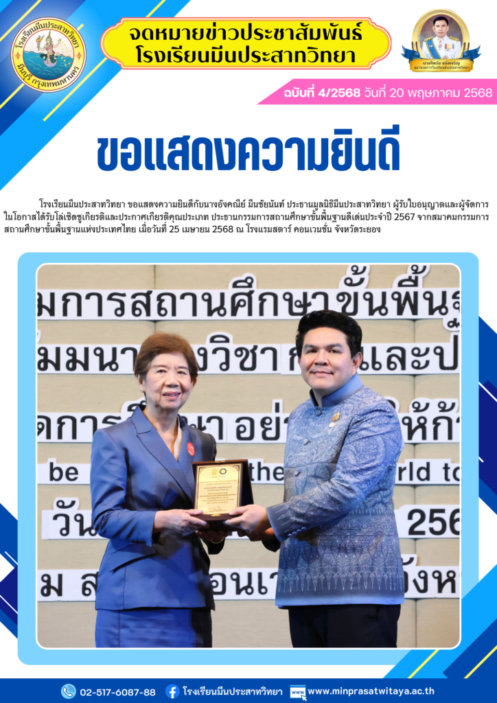 วันอังคาร 20 พฤษภาคม 2025โรงเรียนมีนประสาทวิทยา ขอแสดงความยินดีกับนางอังคณีย์ มีนชัยนันท์ ประธานมูลนิธิมีนประสาทวิทยา ผู้รับใบอนุญาตและผู้จัดการ ในโอกาสได้รับโล่เชิดชูเกียรติและประกาศเกียรติคุณประเภท ประธานกรรมการสถานศึกษาขั้นพื้นฐานดีเด่นประจำปี 2567 จากสมาคมกรรมการสถานศึกษาขั้นพื้นฐานแห่งประเทศไทย เมื่อวันที่ 25 เมษายน 2568 ณ โรงแรมสตาร์ คอนเวนชั่น จังหวัดระยอง
