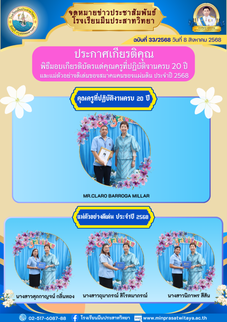 • ประกาศเกียรติคุณ พิธีมอบเกียรติบัตรแด่คุณครูที่ปฏิบัติงานครบ 20 ปี และแม่ตัวอย่างดีเด่นของสมาคมคนของแผ่นดิน ประจำปี 2568