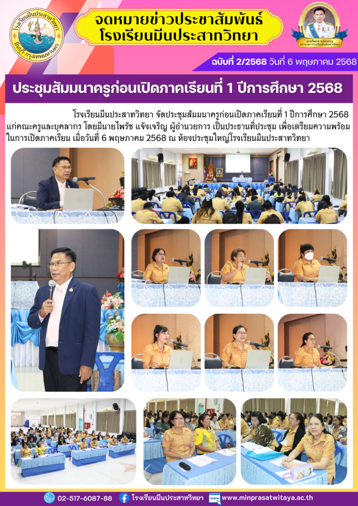 โรงเรียนมีนประสาทวิทยา จัดประชุมสัมมนาครูก่อนเปิดภาคเรียนที่ 1 ปีการศึกษา 2568 แก่คณะครูและบุคลากร โดยมีนายไพรัช แจ้งเจริญ ผู้อำนวยการ เป็นประธานที่ประชุม เพื่อเตรียมความพร้อม ในการเปิดภาคเรียน เมื่อวันที่ 6 พฤษภาคม 2568 ณ ห้องประชุมใหญ่โรงเรียนมีนประสาทวิทยา
