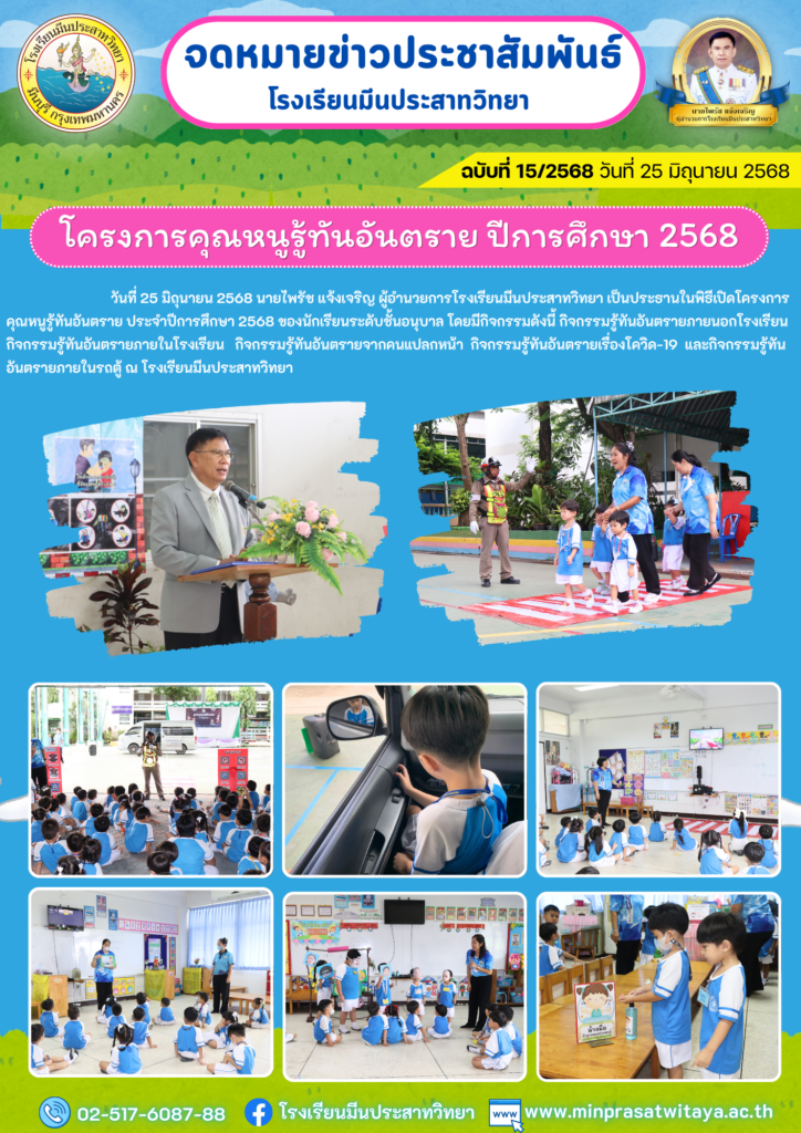 วันพุธ 25 มิถุนายน 2025วันที่ 25 มิถุนายน 2568 นายไพรัช แจ้งเจริญ ผู้อำนวยการโรงเรียนมีนประสาทวิทยา เป็นประธานในพิธีเปิดโครงการคุณหนูรู้ทันอันตราย ประจำปีการศึกษา 2568 ของนักเรียนระดับชั้นอนุบาล โดยมีกิจกรรมดังนี้ กิจกรรมรู้ทันอันตรายภายนอกโรงเรียน กิจกรรมรู้ทันอันตรายภายในโรงเรียน กิจกรรมรู้ทันอันตรายจากคนแปลกหน้า กิจกรรมรู้ทันอันตรายเรื่องโควิด-19 และกิจกรรมรู้ทันอันตรายภายในรถตู้ ณ โรงเรียนมีนประสาทวิทยา