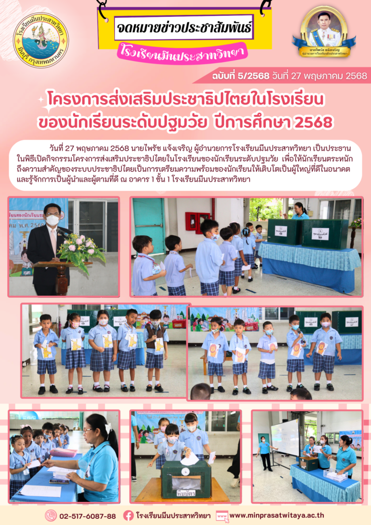 วันที่ 27 พฤษภาคม 2568 นายไพรัช แจ้งเจริญ ผู้อำนวยการโรงเรียนมีนประสาทวิทยา เป็นประธานในพิธีเปิดกิจกรรมโครงการส่งเสริมประชาธิปไตยในโรงเรียนของนักเรียนระดับปฐมวัย เพื่อให้นักเรียนตระหนักถึงความสำคัญของระบบประชาธิปไตยเป็นการเตรียมความพร้อมของนักเรียนให้เติบโตเป็นผู้ใหญ่ที่ดีในอนาคตและรู้จักการเป็นผู้นำและผู้ตามที่ดี ณ อาคาร 1 ชั้น 1 โรงเรียนมีนประสาทวิทยา