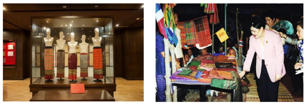 ภายใต้มูลนิธิส่งเสริมศิลปาชีพฯ จนถึงปัจจุบันนอกจากนี้ ยังทรงเผยแพร่ความงดงามของผ้าไหมและหัตถกรรมไทย สู่สายตาชาวโลก ผืนผ้าจากภูมิปัญญาชาวบ้านกลายเป็นฉลองพระองค์อันวิจิตร โดยใน พ.ศ. 2505 ทรงได้รับเลือก ให้เป็นสตรีที่แต่งพระองค์งามที่สุดในโลกผู้หนึ่ง ในจำนวนสุภาพสตรีของโลกทั้งหมด 10 คน จากบรรดาผู้เชี่ยวชาญ การออกแบบเครื่องแต่งกายสตรีของโลก ทรงนำความงดงามของผ้าไทยให้เป็นที่รู้จักในสังคมวงกว้างและสวมใส่ อย่างแพร่หลาย เพื่อสืบสานพระราชปณิธาน สมเด็จพระนางเจ้าสิริกิติ์ พระบรมราชินีนาถ พระบรมราชชนนีพันปี หลวง ที่ทรงพลิกฟื้นผ้าไทย ทรงทุ่มเทพระวรกาย พระปรีชาญาณ และกำลังพระราชทรัพย์ส่วนพระองค์ ทำให้ผ้า ไทยกลับคืนสู่สังคมไทย